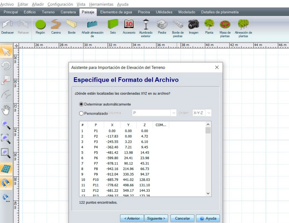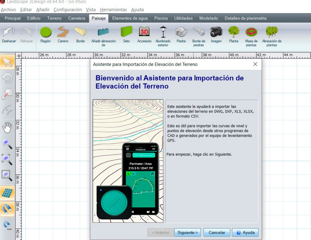 Además de la importación de la planimetría, también podrás importar en Landscape3Design archivos CSV de elevación del terreno, obtenidos con Moasure, teniendo de forma automática las líneas de contorno y las curvas de nivel.